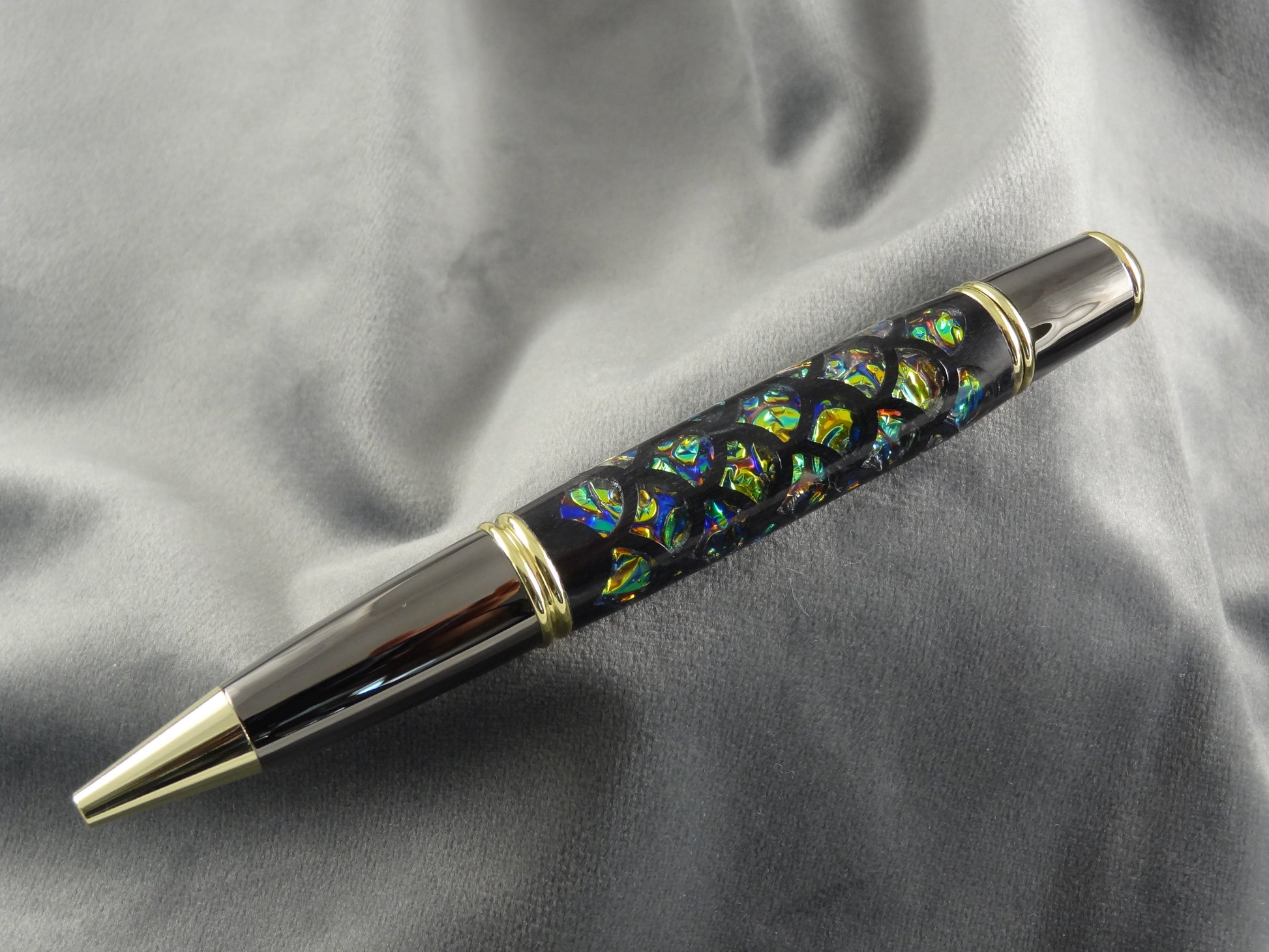 Dichrolam is the highest tech, most optically complex, most visually dynamic, and viewer-interactive composite in the world. It is what the gemstone opal would look like in sheet form. Comprised of over nine different polymer layers laminated in 3 separate steps. Although the Burls appear metallic, they have no metal in them. The reflectivity comes from the light wavelengths. A variety of applications include luxury sports car interiors, custom guitar faces, inlays to bowls, and jewelry making. Laser-cut dragon scales are cut into black dyed wood. This pen is beautiful.