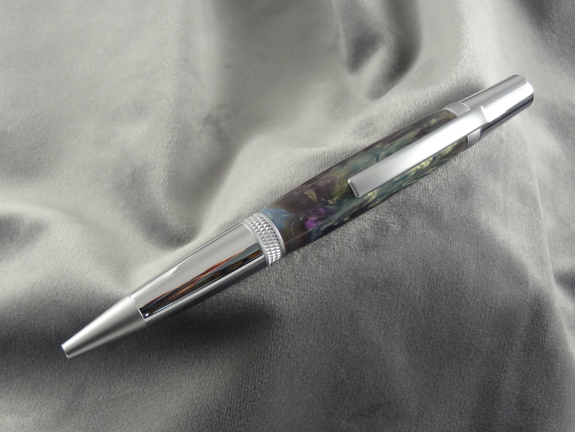 Gator Juice is what you get when magenta, purple and two lush shades of green collide in a swirl of chaotic perfection. Bursting with bold personality, this is some premium eye candy. The Diamond Knurl Pen kit is a no-nonsense pen you will want to write with daily. This pen is finished in chrome with satin chrome accents and diamond etching around the band. This pen uses a Parker style ink refill, replacements available at all office supply locations.
