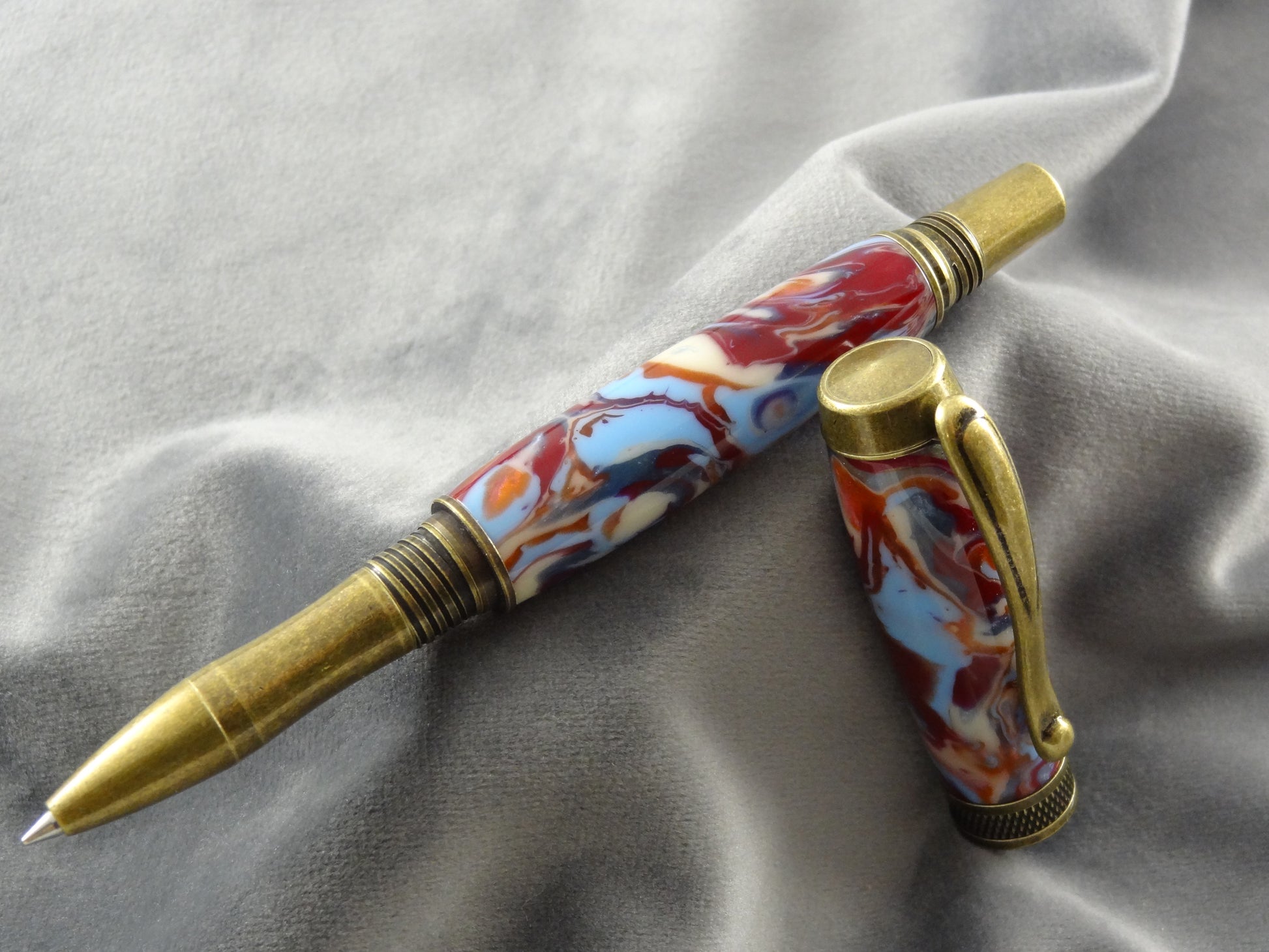 The Laguna Vista pen blank was poured using a special technique that produces wild swirls of color throughout. The blues, reds, caramels give the pearlescence a beautiful look. The Dashing Diamond Knurl pen kit captivates with its sparkle, commanding attention in any crowd. This well balanced antique brass pen has diamond etchings on the band. The Schmidt 9000 ink cartridge provides a smooth, consistent ink flow, reliable performance, and high-quality ceramic ball technology. It delivers a clean, even writing experience, making them a preferred choice for users who value quality and writing comfort. Refills are available at all office supply stores.
