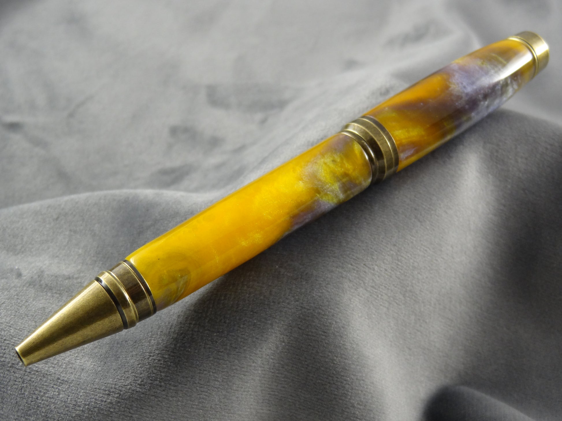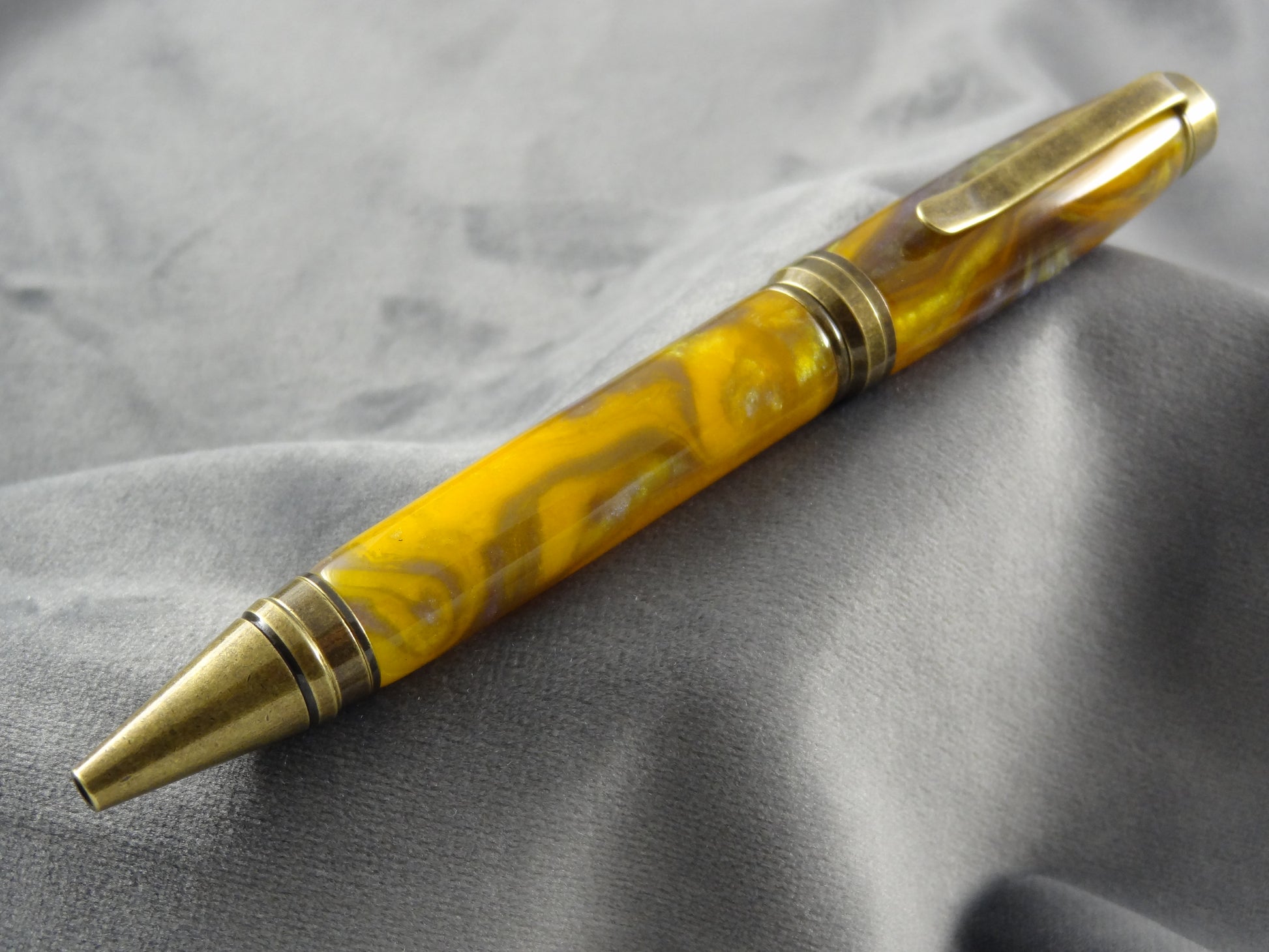 Norse Pride inspired blank with beautiful golds, silvers and deep yellows. Finished in Antique Brass, this pen is big, handsome and a powerfully built writing instrument. This pen uses a Parker style ink cartridge, and replacements are available where office supplies are sold.