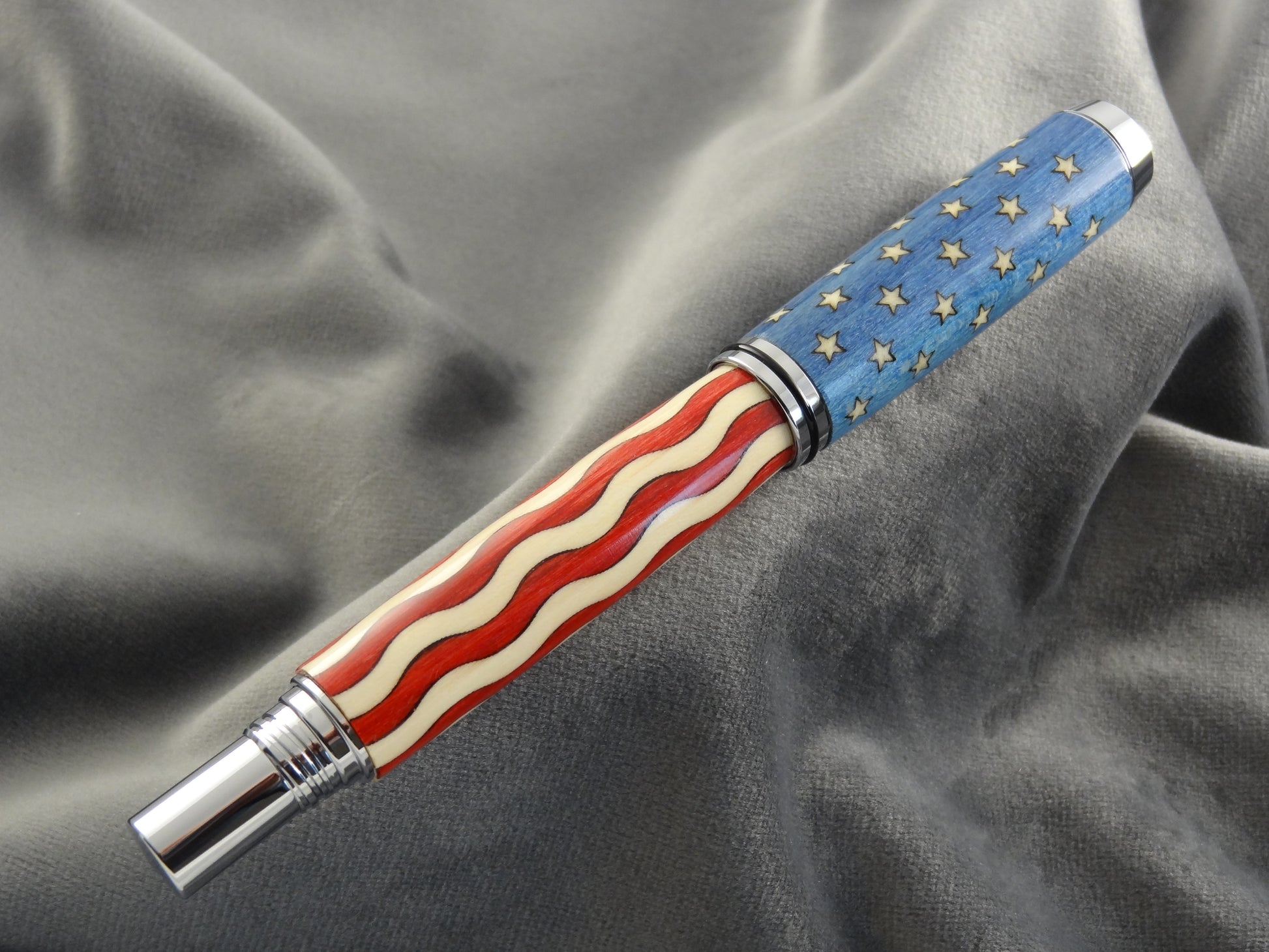 This rollerball pen is the perfect gift for anyone who loves the flag or our country! The inlay kit has 50 stars and 13 stripes, all individually placed and glued into place. Then, it is turned on a lathe and given a beautiful finish. This is a gift all patriots would love to have. It looks and fits wonderfully in the rifle case as pictured below.