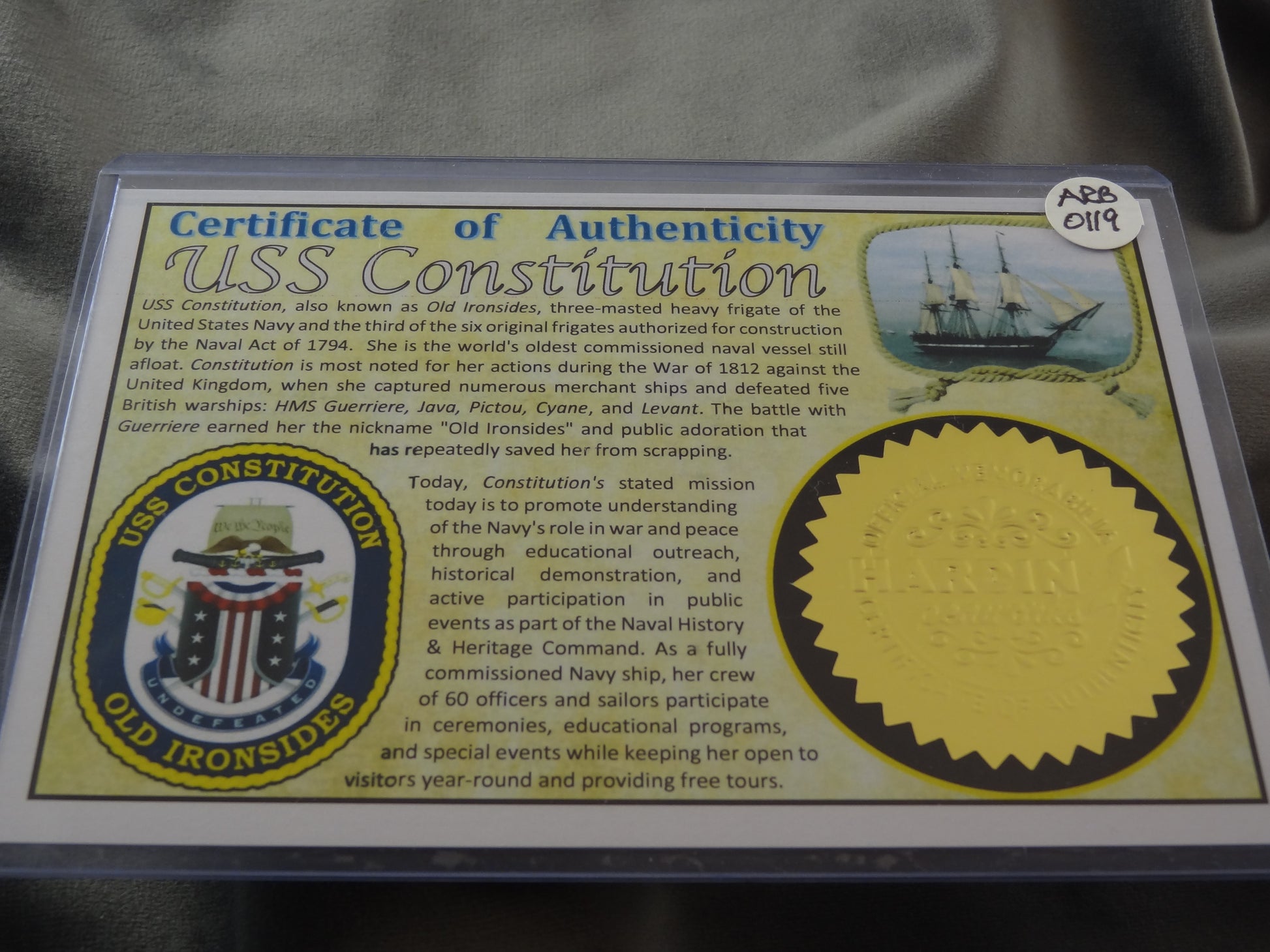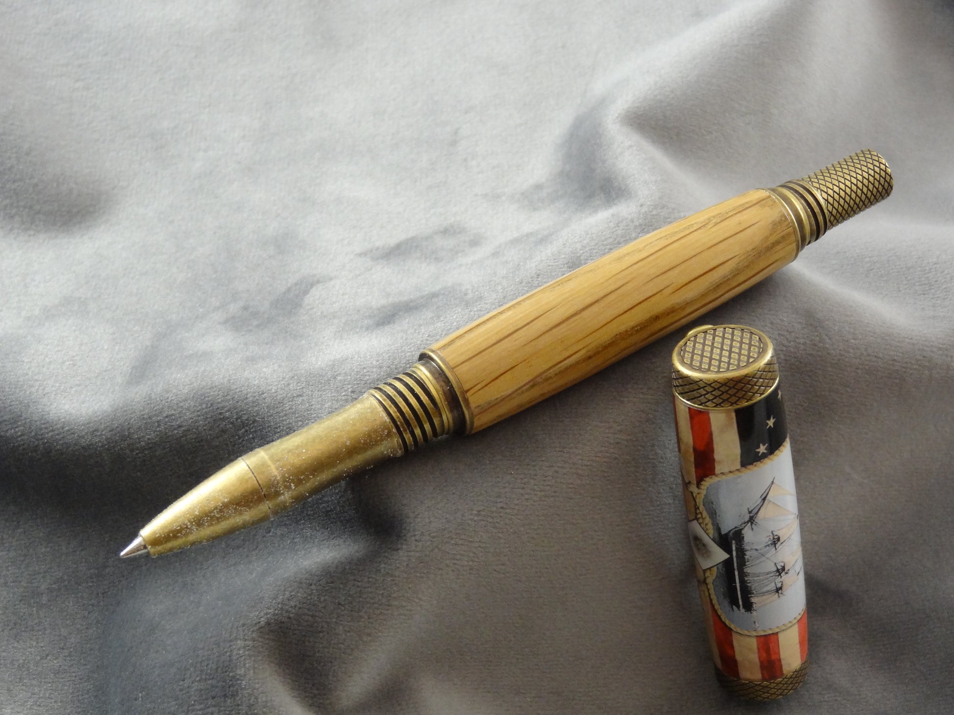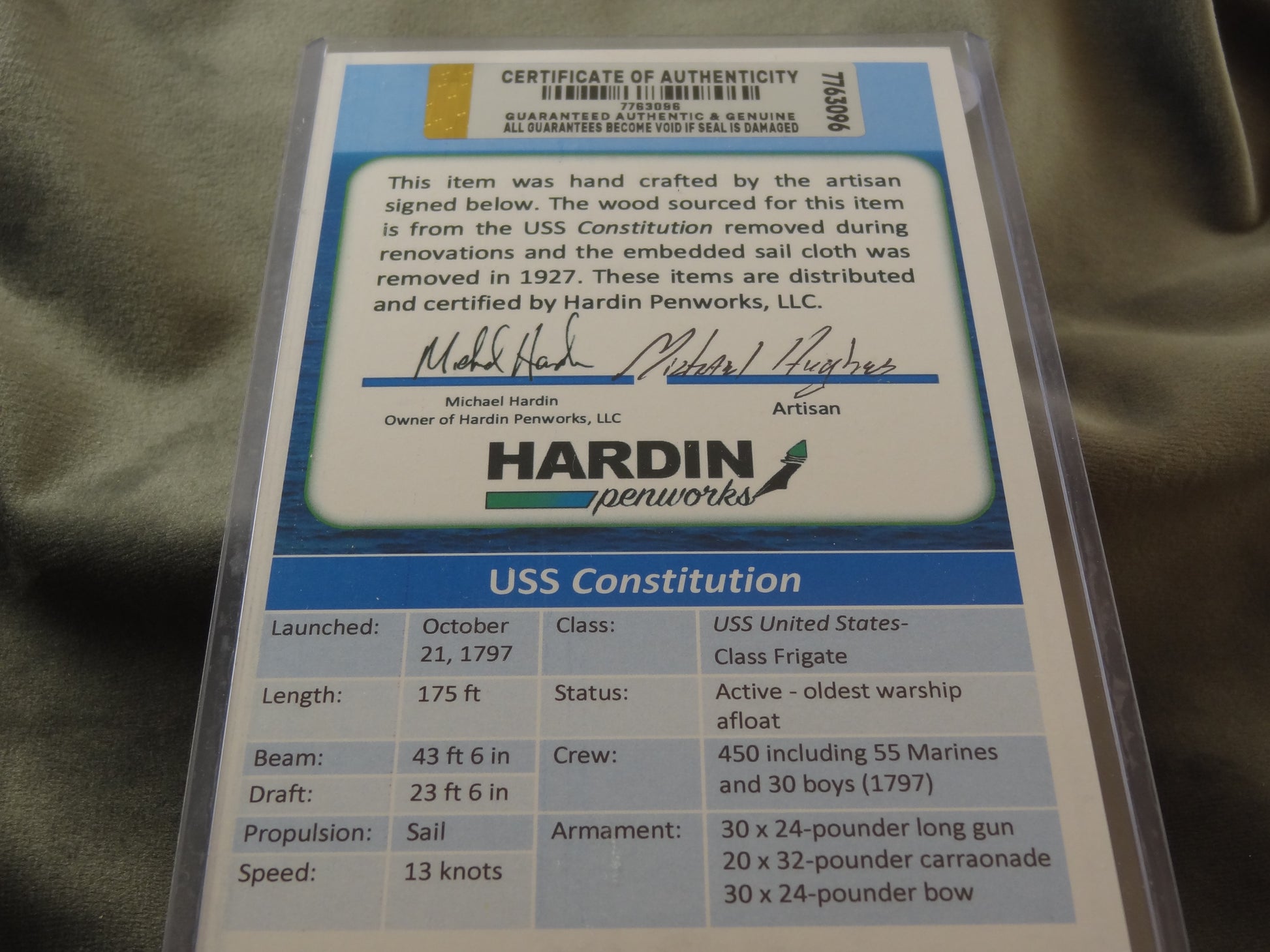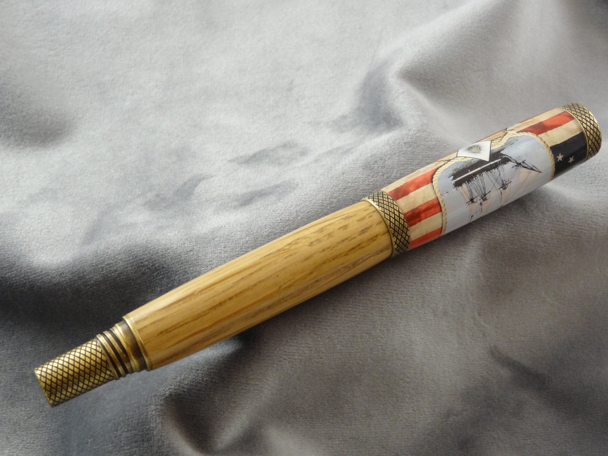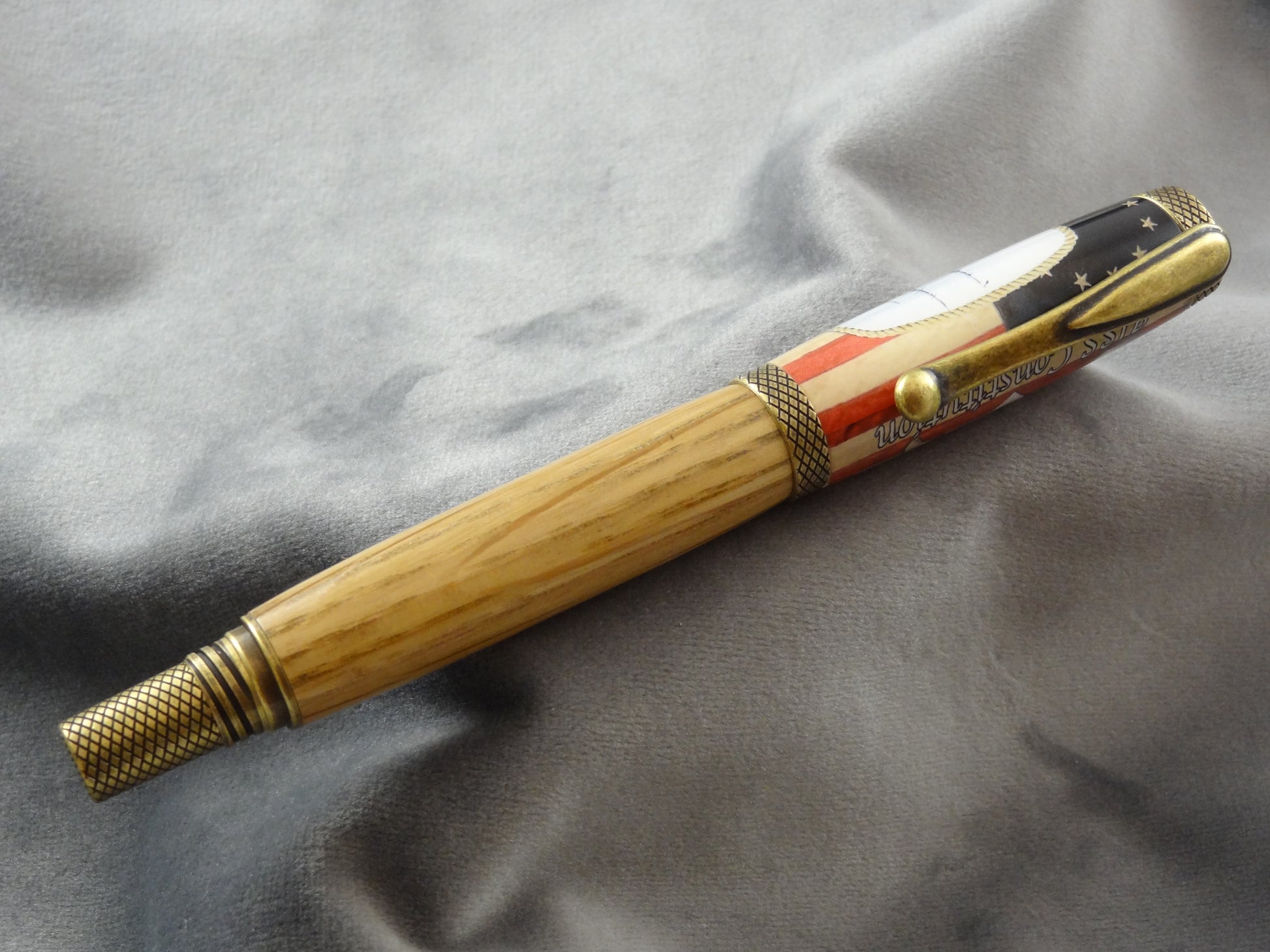 This pen contains a piece of wood sourced from the USS Constitution removed during renovations. With a beautiful replica of the ship, laid on the American Flag and finished with an Antique Brass kit. Comes with a Certificate of Authenticity.